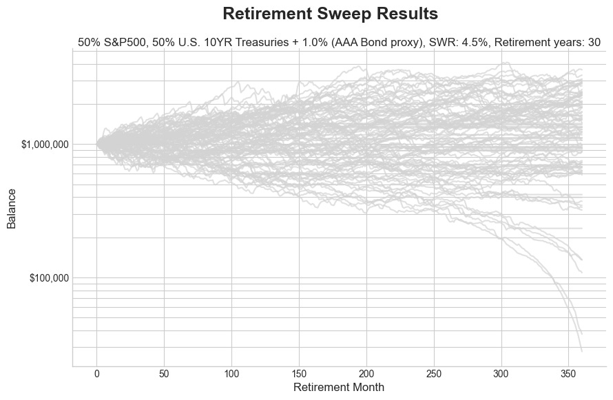 In these simulated results, there was a single failure where the account balance reaches 0 before the 30 year retirement; that was at about 28 years. But there are times the balance is ~ $7M.