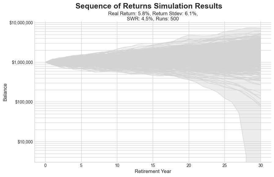 The chart above is a simulation of the balance of a retirement account, that starts with $1M, over a 30 year retirement. There are 500 runs of the simulation, and thus 500 simulated balances, for a SWR of 4.5% assuming average returns of 5.8% at a 6.1% stdev. (This is the approximate return and stdev for a portfolio of 40% stock, 60% high yield bonds.)