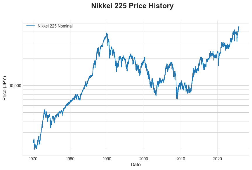 The chart above shows the Nikkei 225 (JAN 1970 - SEP 2025). The Nikkei 225 is roughly the Japanese equivalent of the S&P500, as it is the most prominent stock index tracking major Japanese companies on the Tokyo Stock Exchange, serving as a key economic barometer. (The Nikkei 225 and S&P500 differ significantly in calculation as the Nikkei 225 is price-weighted, while the S&P 500 is market-cap weighted.)